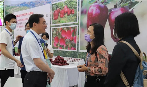 副縣長杜興為廣州市商務(wù)局會展處副處長、廣州商務(wù)會展促進服務(wù)中心副主任陳建莎介紹甘谷蘋果